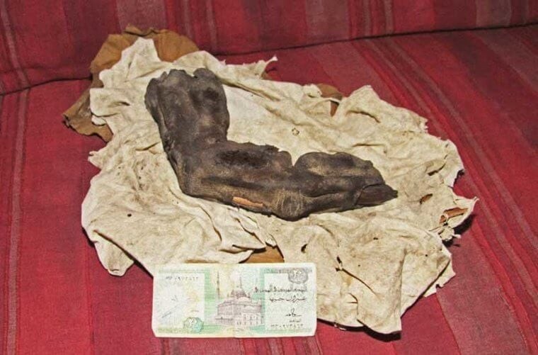 If we remove the dollar bill and sofa as reference, one might think this is a normally sized mummified finger. However, this finger is gigantic and raised serious questions when it was found by a gravedigger.