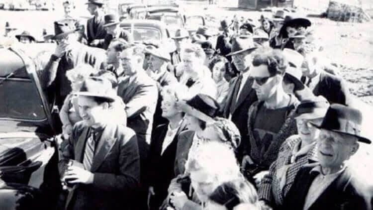 He is also wearing a printed shirt that only became fashionable years later. Some people believe that he is a time traveler at the opening of the Golden Bridge in Canada. The man next to him is using a camera typical of that time period, and the people around him do not seem to be bothered by this mysterious man.