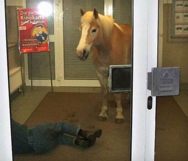 We really can't explain what happened before this picture was taken, but it seems that the ATM lobby was the scene of a horse-related incident. How did the horse even get there, and why is someone lying on the ground while the horse stands there nonchalantly?