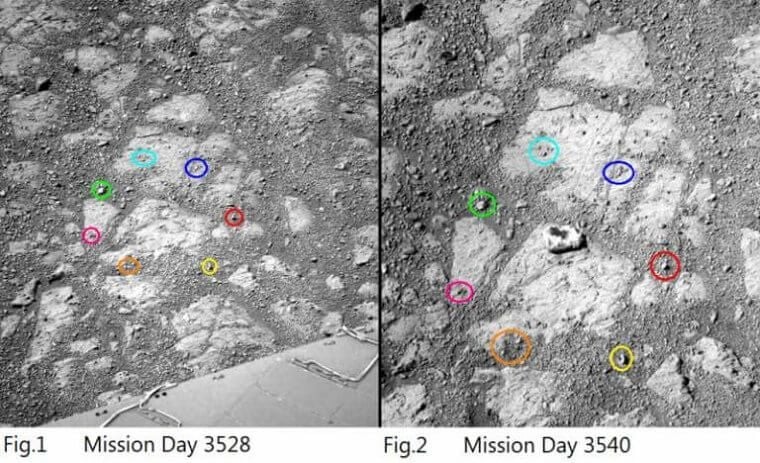 But when the same image was taken only 12 days later, something had changed. A rock in the midst of the formation, which wasn't there before, appeared randomly. How did it get there if there is no life on the planet?