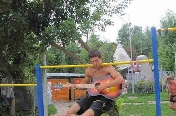 At first glance, you might think this boy is just playing the guitar for his family. But if you look closely, you'll notice that he's playing the guitar while hanging from a chin-up bar with his chin.