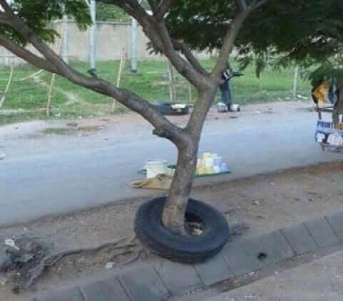 We bet you won't find an explanation for this image. We have tried to figure out how it happened and are just as puzzled as you are. The tire is completely intact around the trunk of a mature tree, but how did it get there?