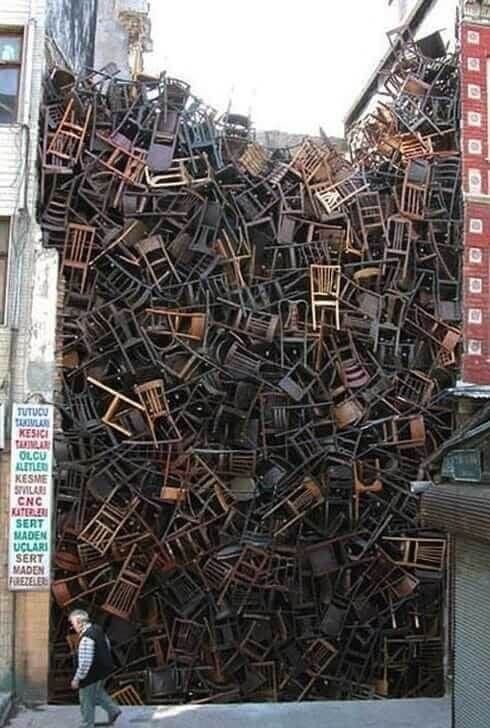 For size comparison, the man at the bottom is probably of average height and looks tiny compared to the pile of chairs. The thing is, we don't know where all the chairs came from or how they were stacked so high.